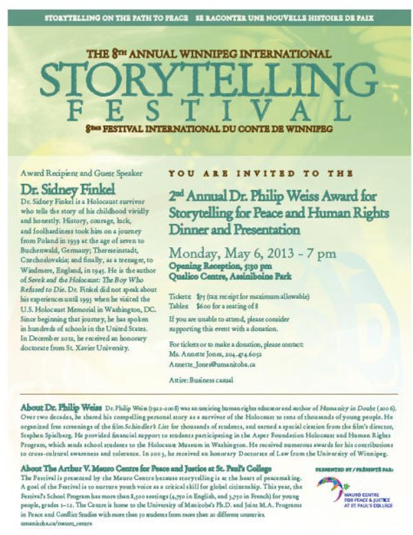 In May of 2013, Sidney received the Philip K. Weiss Award for Storytelling for Peace and Human Rights, where he was introduced by his grandchildren, Bari Finkel and Ike Wade.